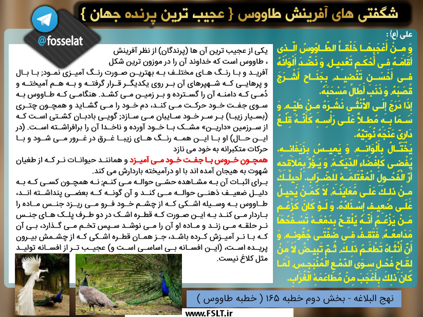 یک علی علیه السّلام ابتدا برای استدلال به وجود خدا به سراغ عجائب کائنات و شگفتیهای آفرینش علی الخصوص پرندگان رفته است از جمله این پرندگان طاووس است.!!